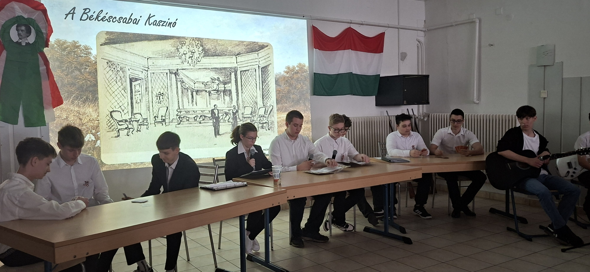 A műsor során a korabeli dokumentumrészletek által megelevenedett a „csabai krónikás” alakja, aki hitelesen közvetítette a forradalmi lázat, majd később a szabadságharc leverése utáni fájdalmas csendet is. Az előadás emlékeztetett minket arra, hogy a történelem nem csupán évszámok halmaza, hanem hús-vér emberek sorsa, akik itt, a mi utcáinkon élték át a magyar szabadság legfényesebb napjait. A diákok előadását filmrészletek, zenés aláfestések és történelmi nagyjainkat megelevenítő AI videók tették még emlékezetesebbé.
