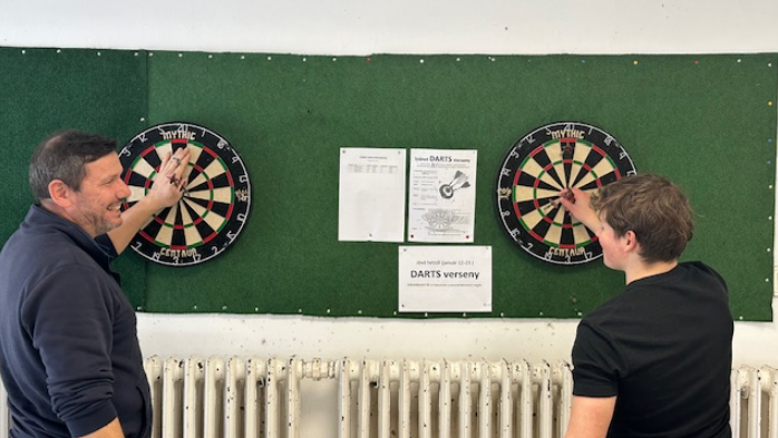 Kedves Diákok! Jövő héten is minden ebédszünetben (12.05-12.30) lehet jönni "darts-ozni" a tornaterem előtti helyszínre. A játék egyszerű (nem egymás ellen kell játszani!), összesen 37 nyilat kell eldobni egy játékhoz. Ez összesen kb. 3 perc. A két hét alatt akárhányszor meg lehet próbálni, a végén az I-III. érem és oklevél díjazásban részesül. Nyilat lehet hozni, de adunk is. Részletes kiírás a helyszínen. Előre nem kell nevezni, csak lejönni és a helyszínen jelezni, hogy szeretnél dobni. Az eredményeket naponta frissítve láthatjátok a táblák mellett.